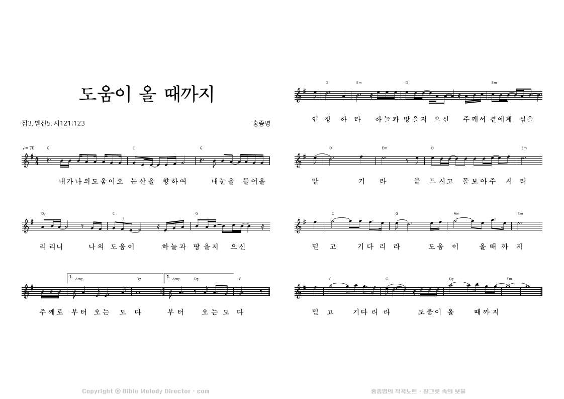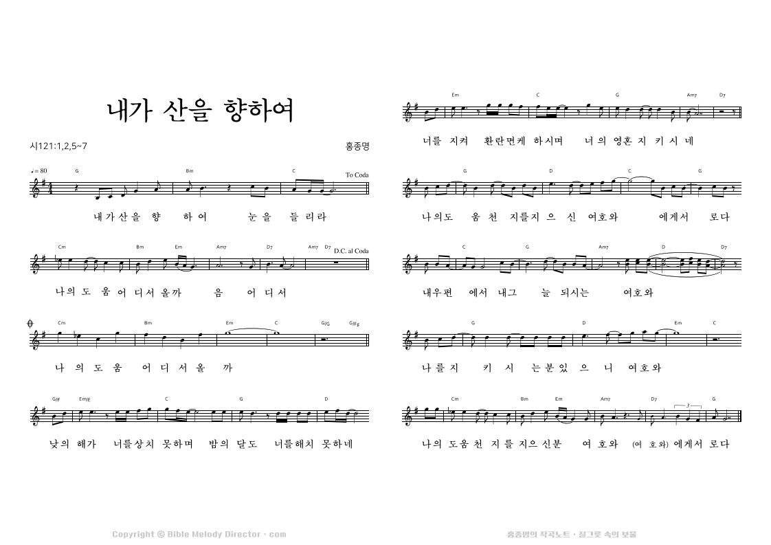 시편 121:1,2과 123:2과 55:22, 잠언 3:6과 베드로전서 5:7의 성경으로 홍종명이 시와 곡을 짓다. 20020115